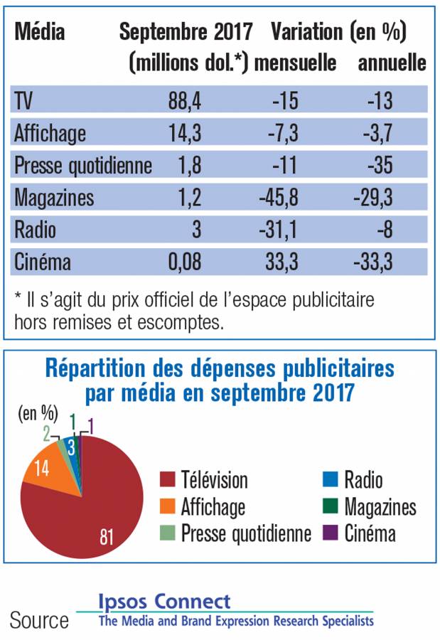 En septembre, les dépenses publicitaires à prix tarifs ont chuté de 12,5 % par rapport au même mois de l’année 2016, à quelque 104,8 millions de dollars. Cette valeur ne tient pas compte des remises et escomptes, fort généreux dans ce secteur. Cette baisse concerne tous les postes : la presse (-35 %), le cinéma (-33 %), les magazines (-29,3 %), la télévision (-13 %), la radio (-8 %) ainsi que l’affichage (-3,7 %). La variation mensuelle des dépenses publicitaires a, elle aussi, connu une baisse significative, de l’ordre de 15,1 % par rapport au mois d’août.